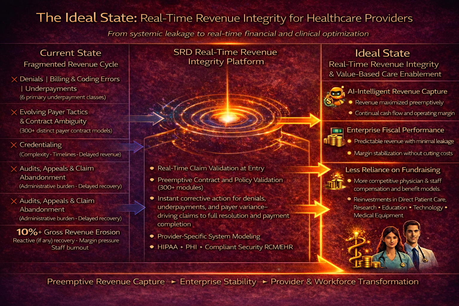 SRD bridges the gap between submitted claims, payer behavior, and actual reimbursement using a proprietary, AI-guided, expert-verified system that models contracts, analyzes claims at scale, and supports resolution with certified revenue cycle professionals. The result is measurable recovery of revenue that was earned but never captured.